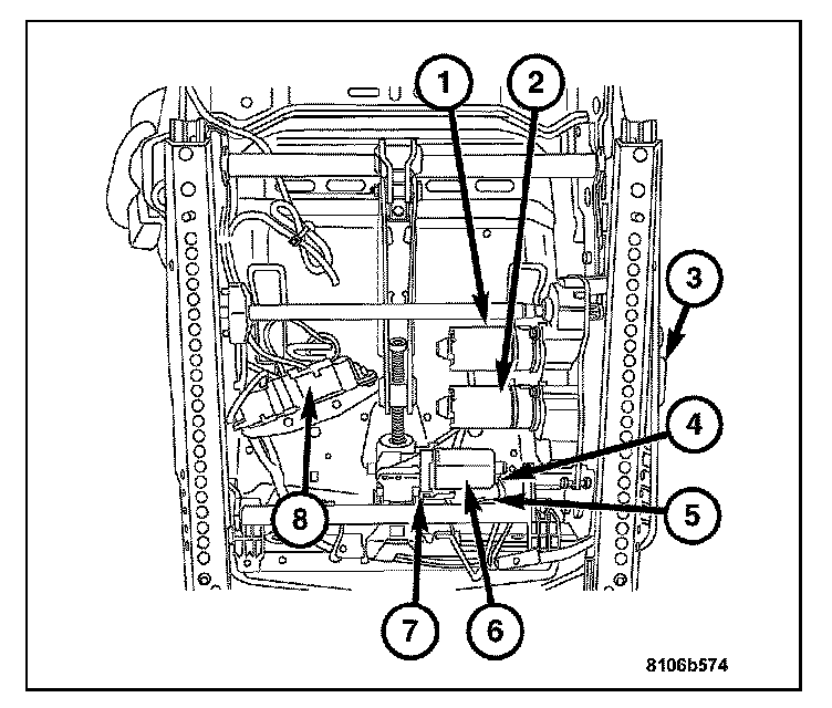 3. Remove the power seat track rear inboard and outboard attachment bolts (1).
