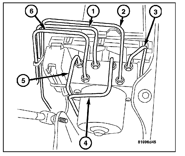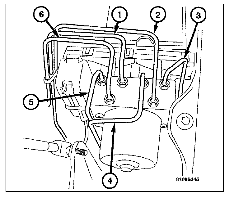4. Install the brake lines (1-6). Pay close attention to the markings when attaching the hydraulic lines.