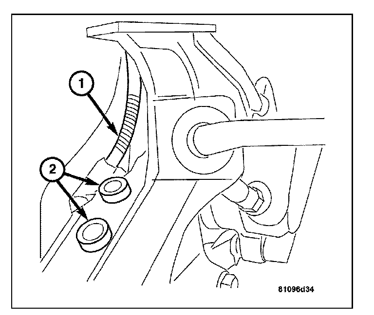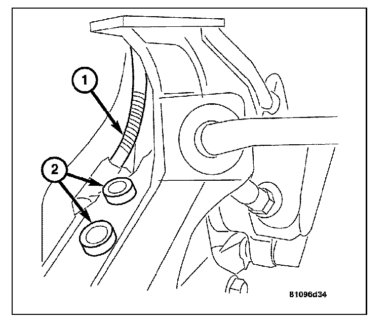 3. Disconnect the wheel speed / brake wear indicator wire harness connector (2) from the body mount connector (1).