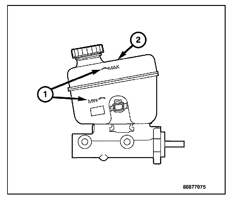 The master cylinder has an aluminum body and a nylon reservoir with a single filler cap. A fluid level indicator (2) is molded into the top of the reservoir. The fill levels (1) are located on the side.