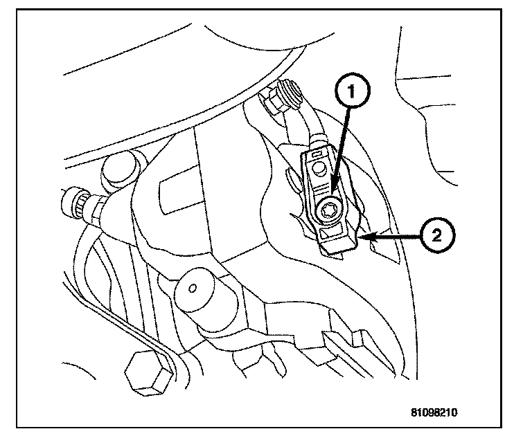 5. Remove brake pad wear indicator (1) from caliper (2) by removing the retaining bolt.