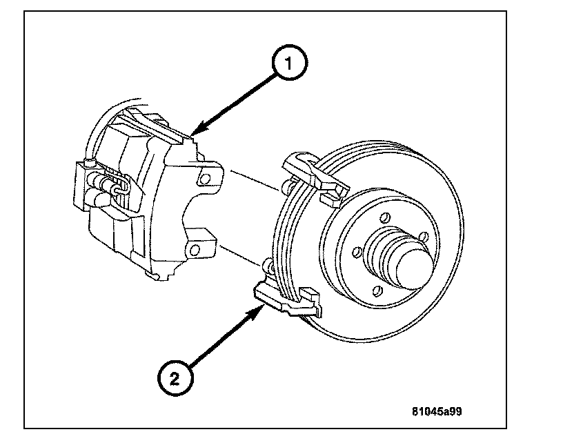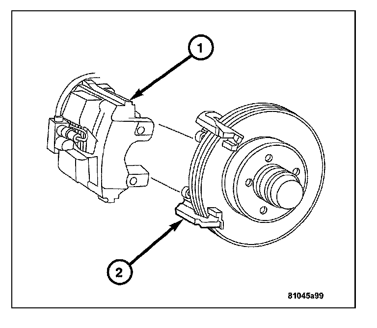 7. Remove the caliper support spring (2) by prying the spring out of the caliper (1).