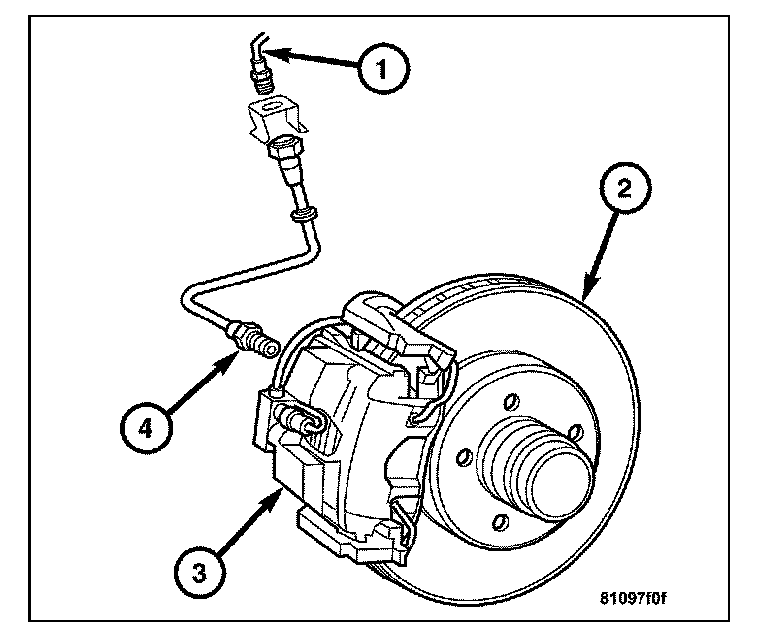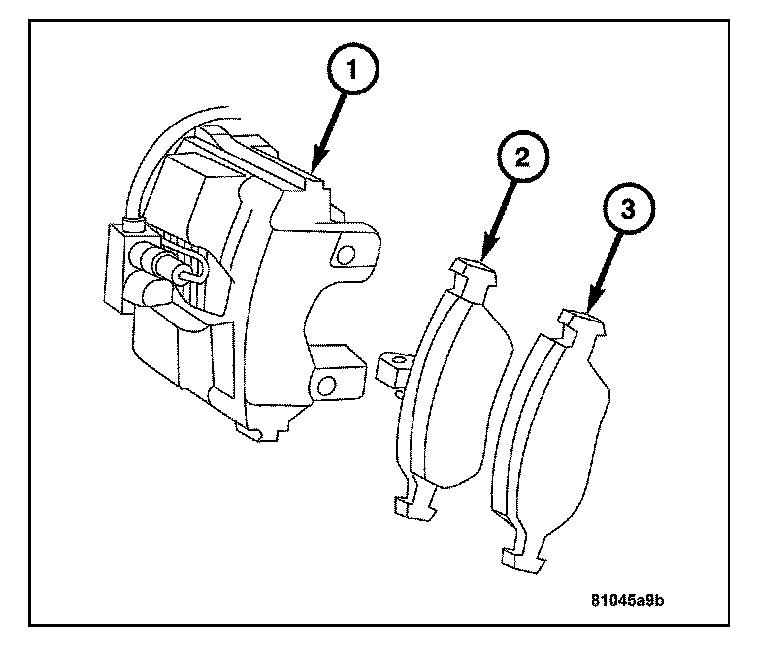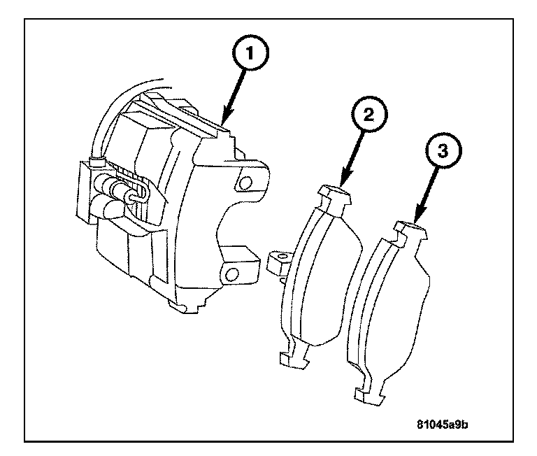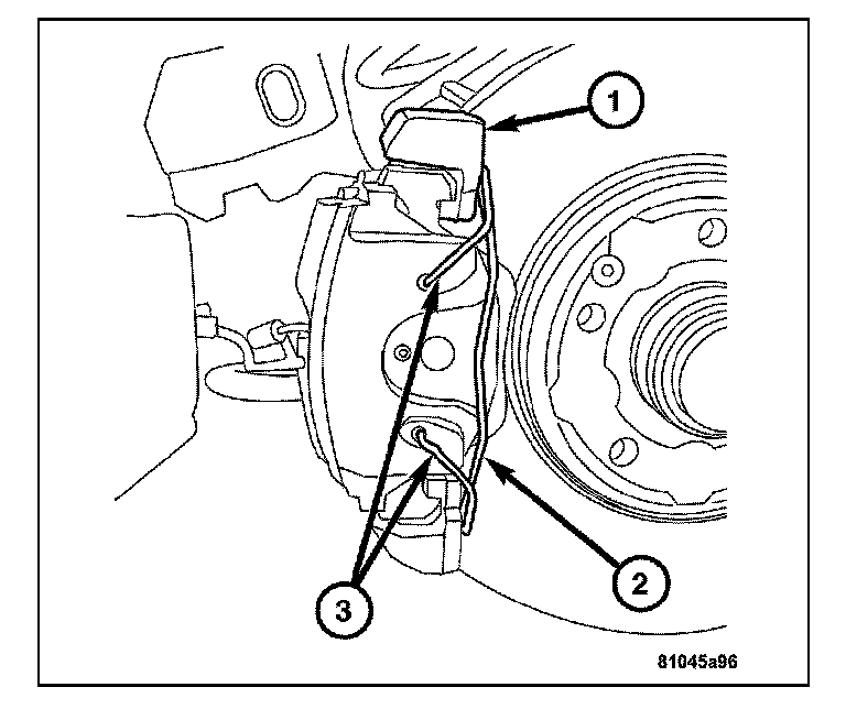 1. Install the inboard and outboard brake pads (2 and 3) onto the caliper (1).