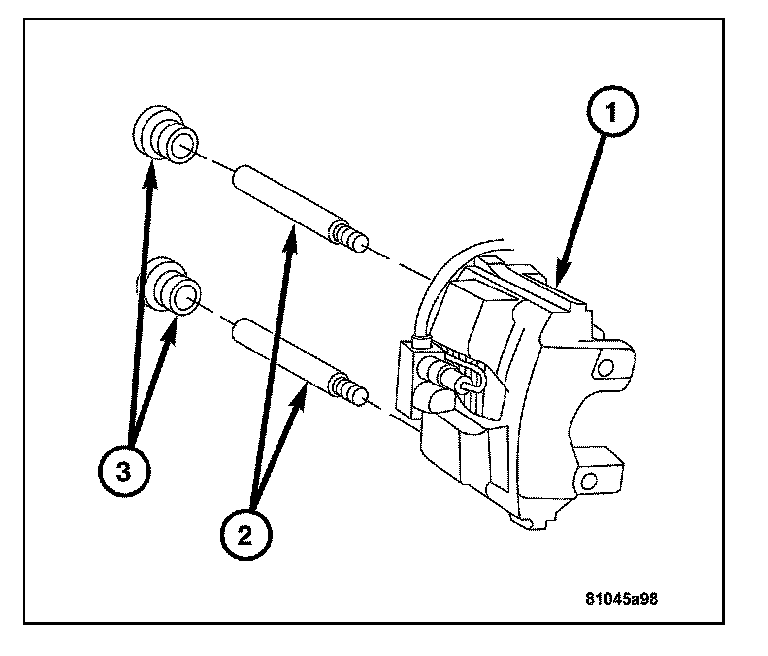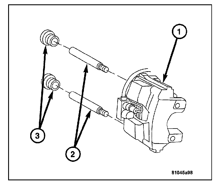 2. Lubricate the slide pins (2) and slide pin bushings with silicone grease.