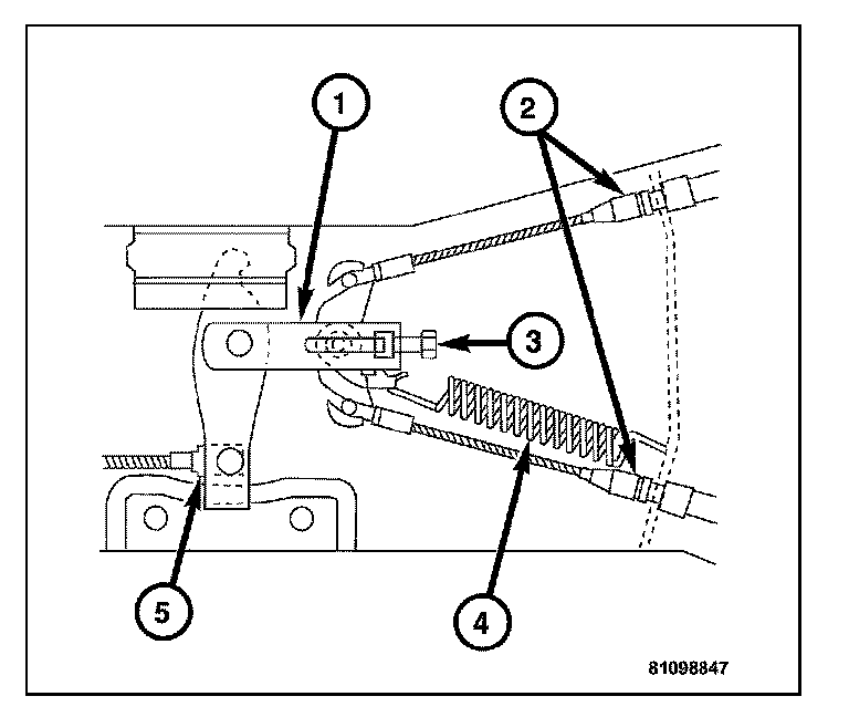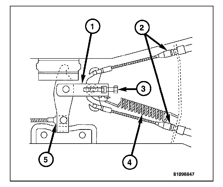6. Tighten the parking brake cable tensioning bolt (3) until the parking brake cables (2) no longer sag.