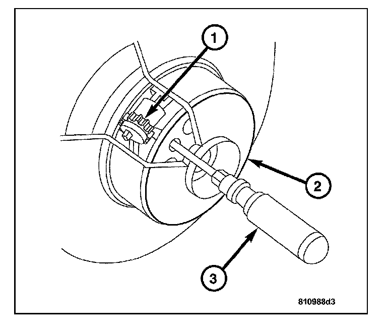 4. Rotate the rear wheel (2) until the parking brake adjuster wheel (1) can be seen through the removed rear wheel bolt. Then using a screwdriver or suitable tool (3), turn the adjusting wheel (1) until the parking brake shoes are applied and the rear wheel (2) no longer turns freely.