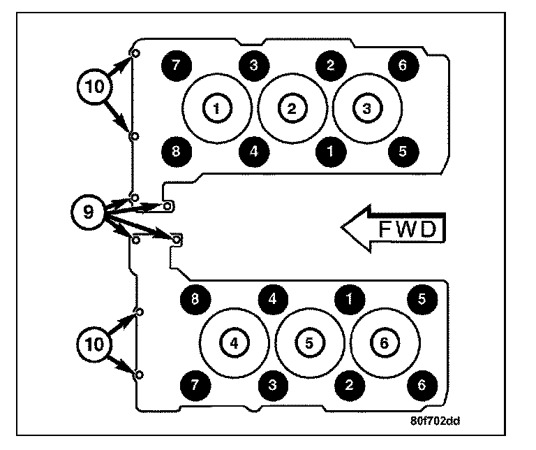 NOTE: Bolts numbered 9 and 10 are timing chain cover bolts. They should be tightened after the cylinder head bolts are tightened.