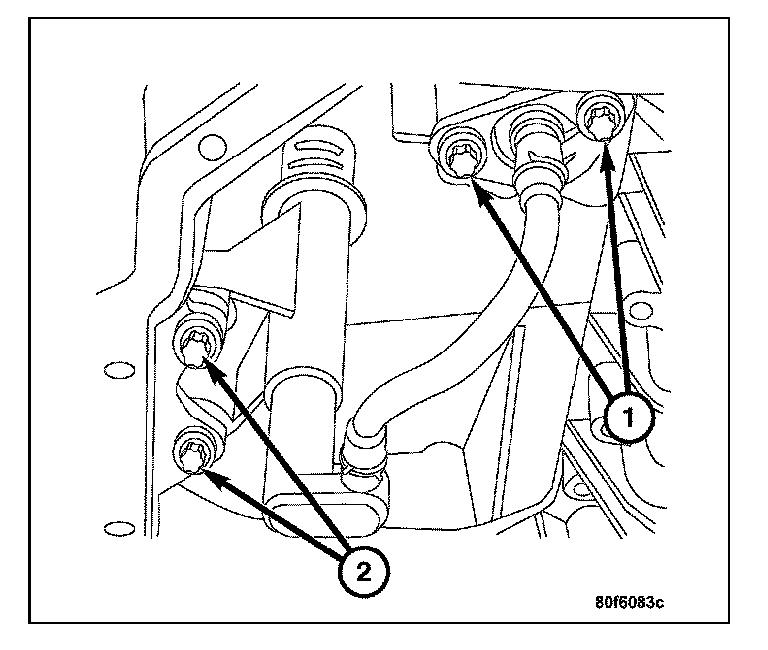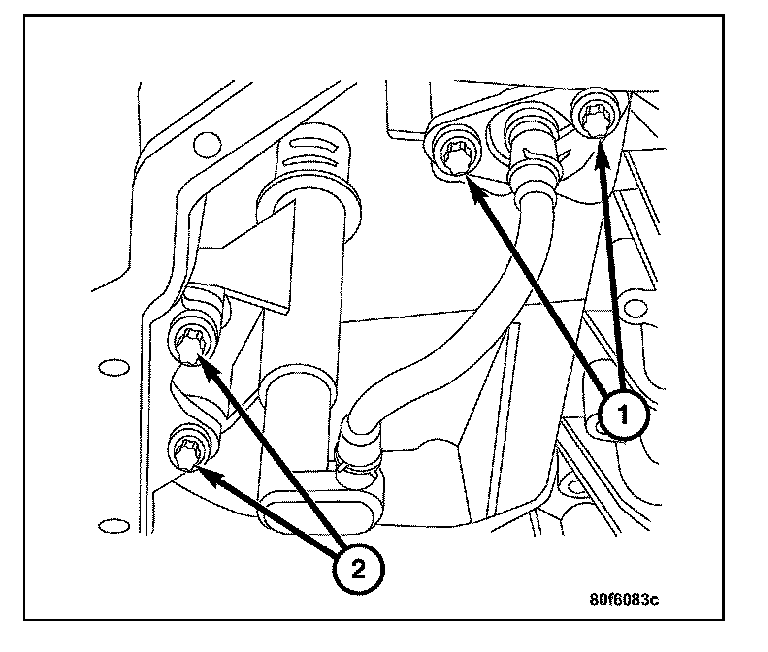 4. Remove the two harness retainer screws (2) and the oil level/temperature sensor.