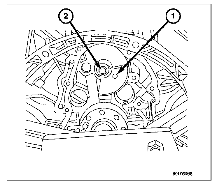 7. Hold the balance shaft rear counter weight (1) with a drift, remove the rear retaining bolt (2).