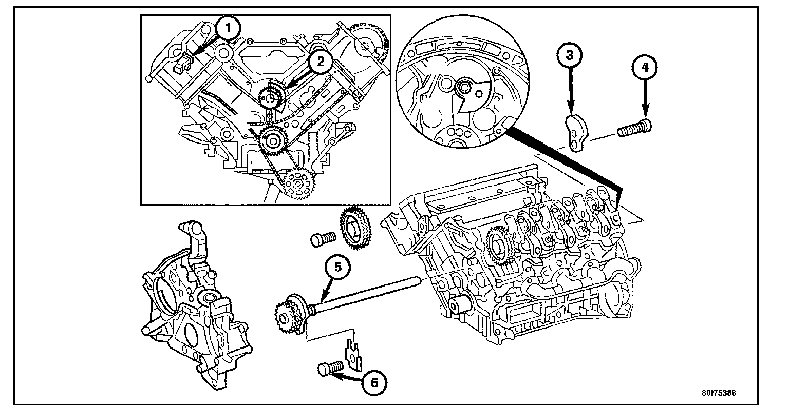9. Remove the balance shaft locking plate bolt (6) and locking plate at the front of the engine block.