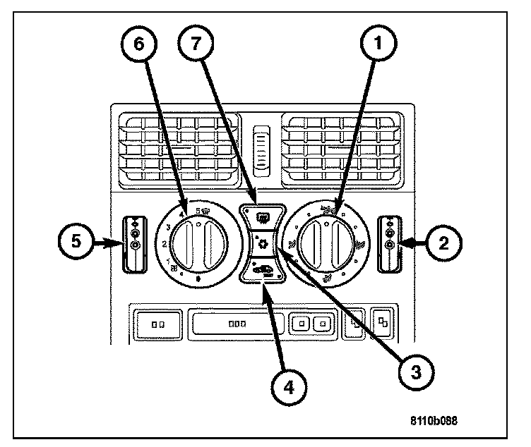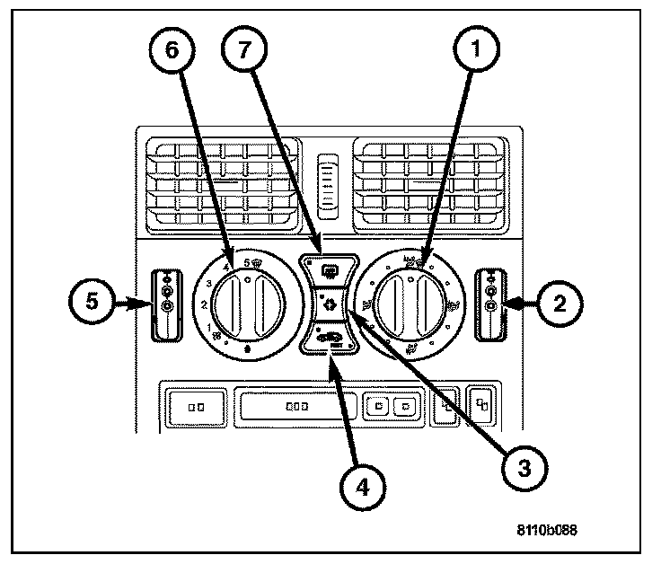 Both A/C heater control module panels are located on the instrument panel inboard of the steering column and above the radio. The A/C heater control panel contains two rotary-type temperature control knobs (2 and 5), a rotary-type mode control switch knob (1), a rotary-type blower motor speed switch knob (6) and an air conditioning compressor push button switch (3).