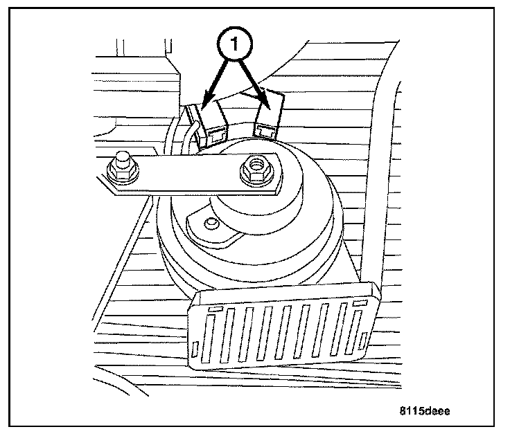 1. Position the horn(s) (1) onto the vehicle core support and install the horn bracket mounting bolt. Tighten the bolt to 11 N.m (100 in. lbs.).
