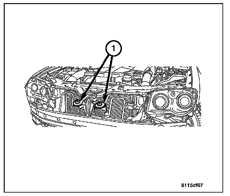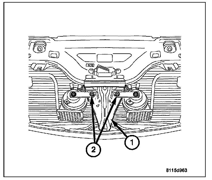 4. Remove the horn bracket mounting bolt (2) from the core support brace (1).