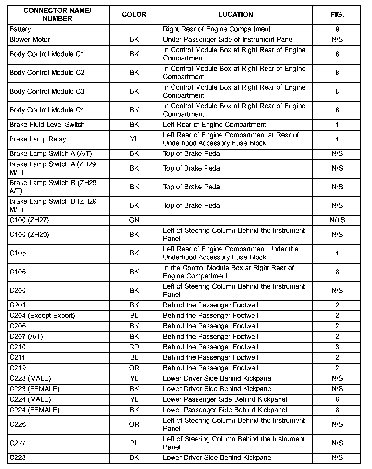 The abbreviation T/O (Take Out) is used in the location column to indicate a point in which the wiring harness branches out to a component.