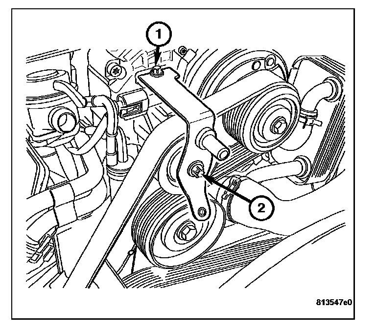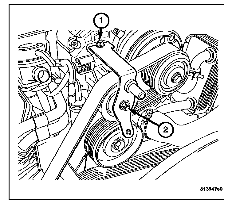 7. Remove the supercharger idler pulley upper retaining bolt (1) and lower retaining bolt (2).