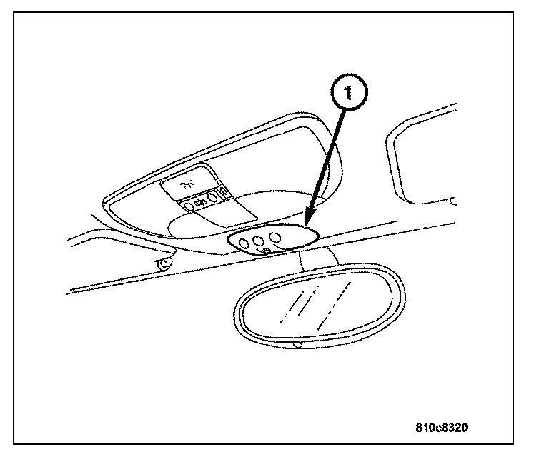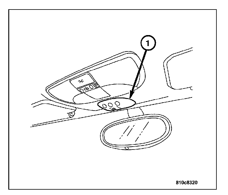 The Tire Pressure Monitoring (TPM) System utilizes a control module (1) to control the system. The TPM module (1) is located in the headliner between the dome lamp and the rear view mirror.