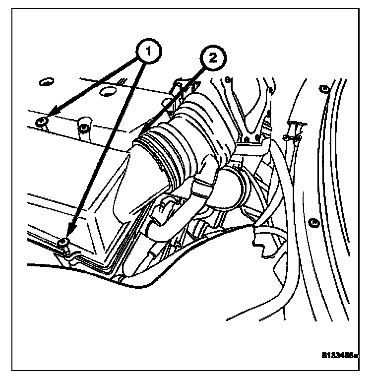 2. Remove the engine cover (1). Grasp both corners of the engine cover, and pull up firmly.