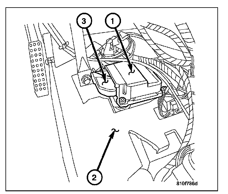 The Occupant Restraint Controller (ORC) is located on the floor beneath the center console.It is secured by four screws to a stamped steel mounting bracket.The arrow which is printed on the label located on the top of the ORC housing (1) provides a visual verification of the proper orientation and should always face the front of the vehicle.