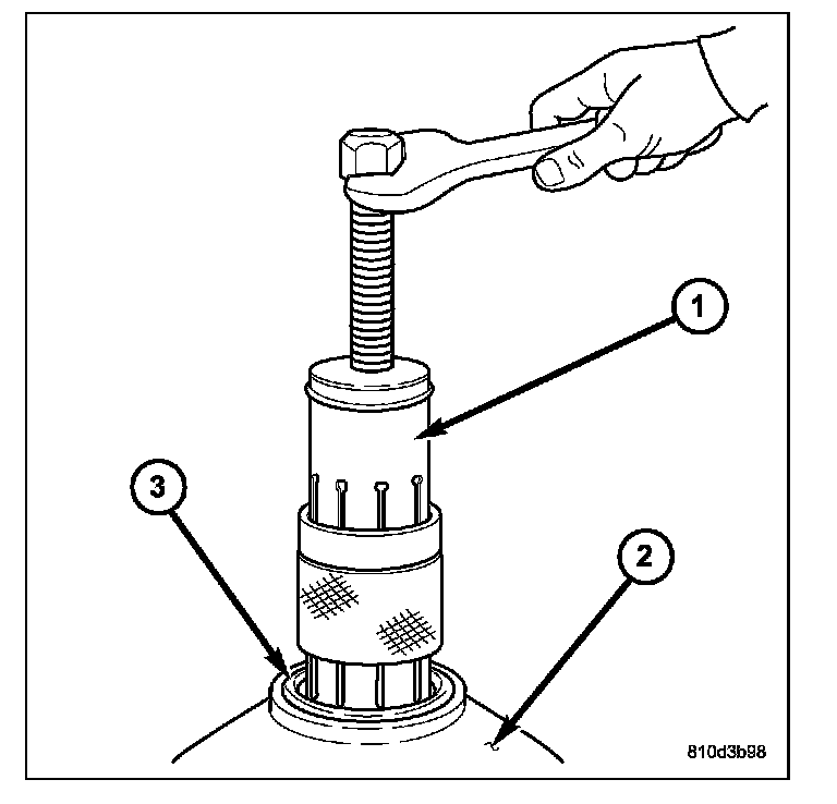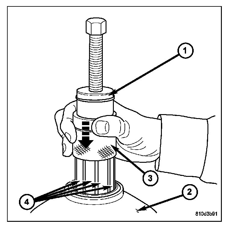 14. Slide the collar (3) on the Bearing Remover 9082 (1) downward over the fingers (4) of the tool.