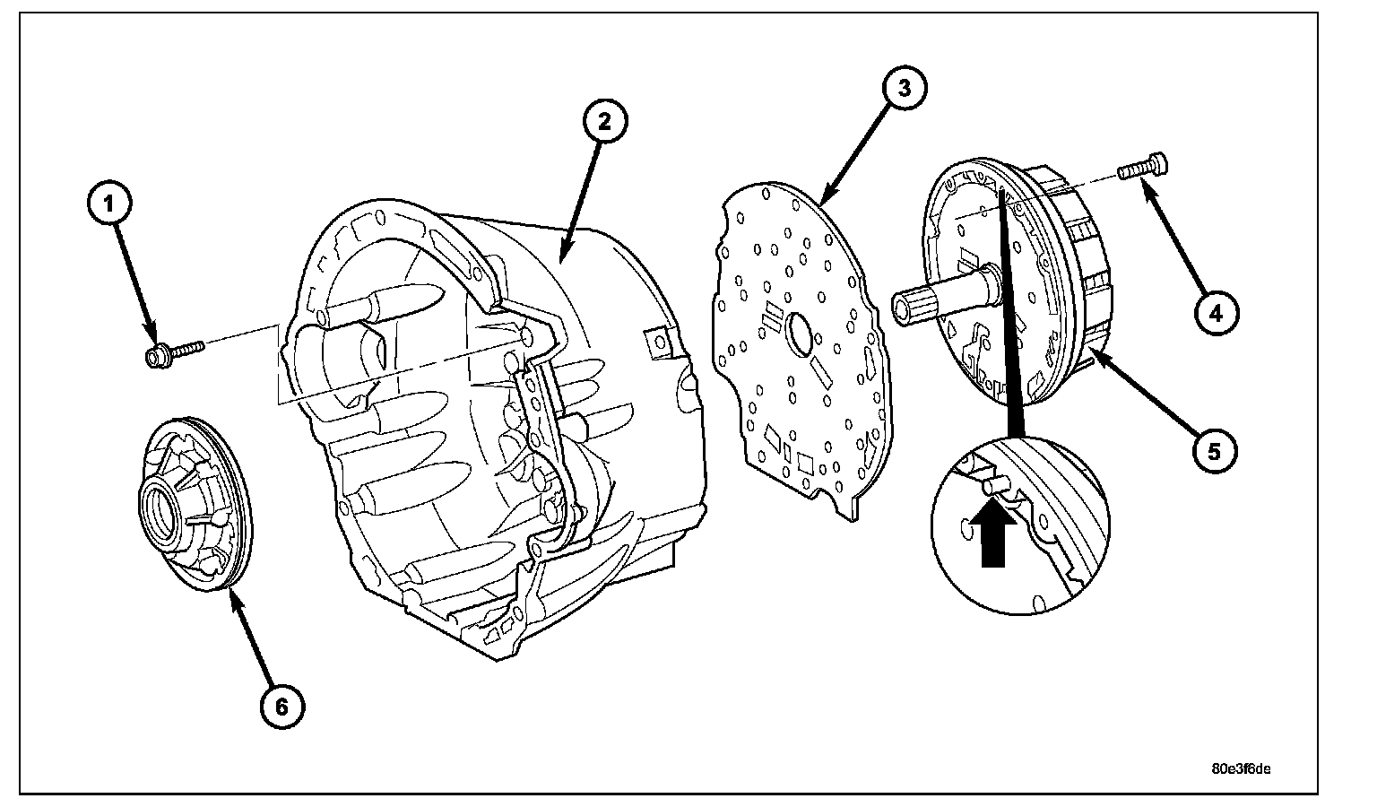25. Unscrew Torx socket bolts (4) and remove oil pump (6). Screw two opposed bolts into the oil pump housing and press the oil pump out of the converter housing by applying light blows with a plastic hammer.