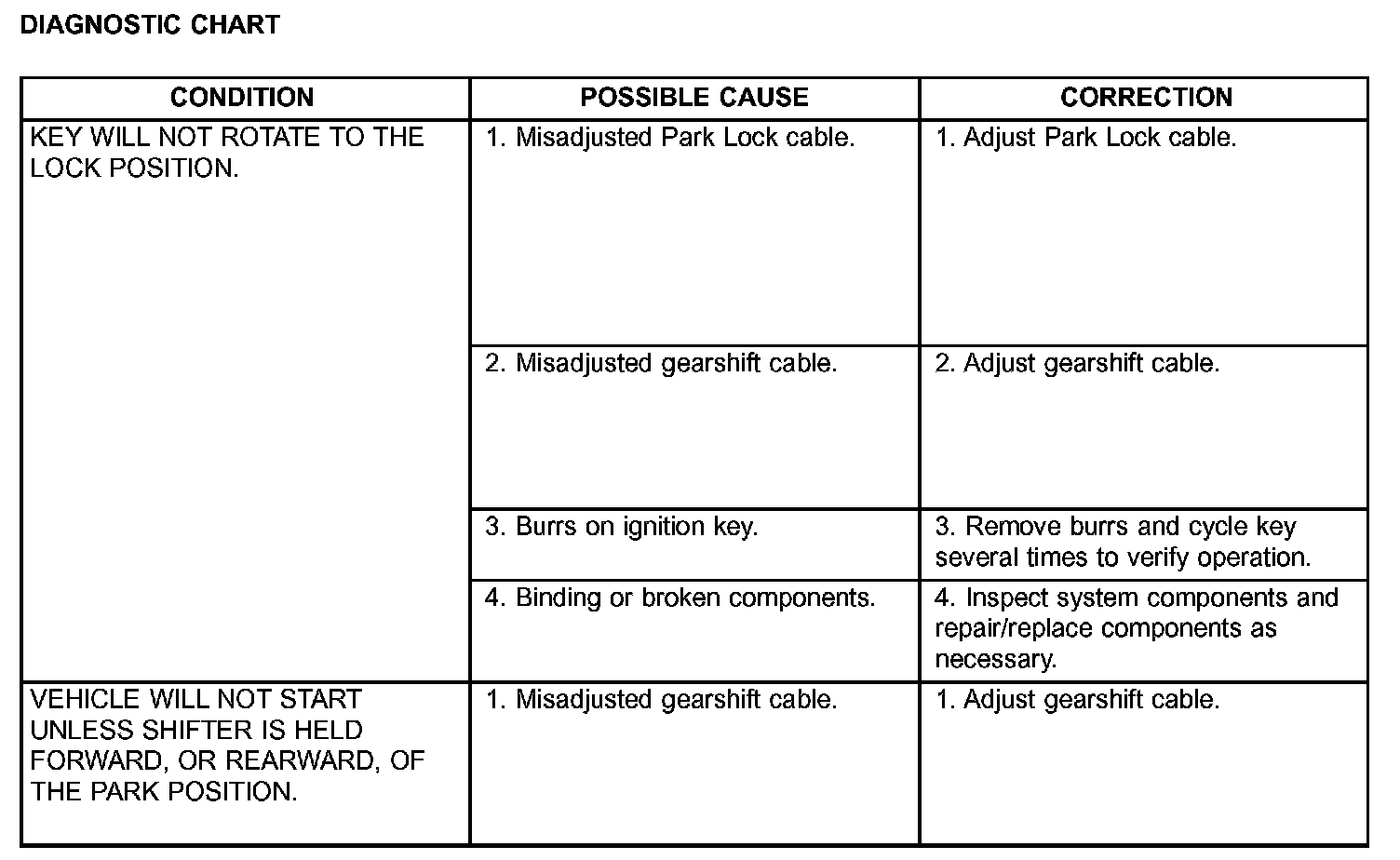 2. When the shift lever is in PARK, the ignition key cylinder should rotate freely from ACC to LOCK. When the shifter is in any other gear or neutral position, the ignition key cylinder should not rotate to the LOCK position.