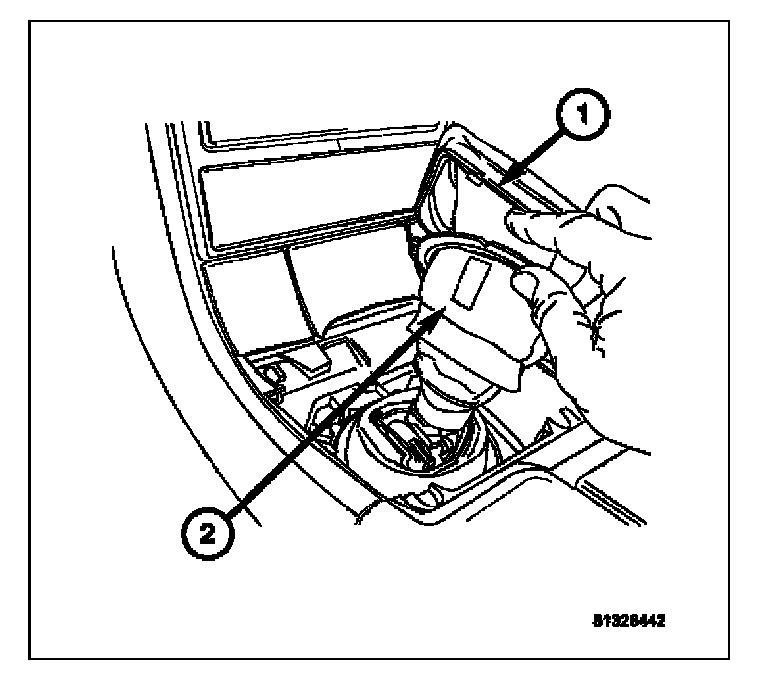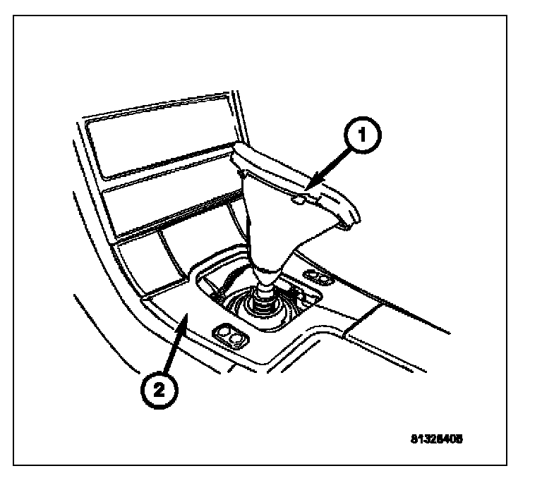 14. Install the shifter bezel (1) over the leather shifter boot (2). Carefully press firmly down in all four corners of the shifter bezel until it locks into place.