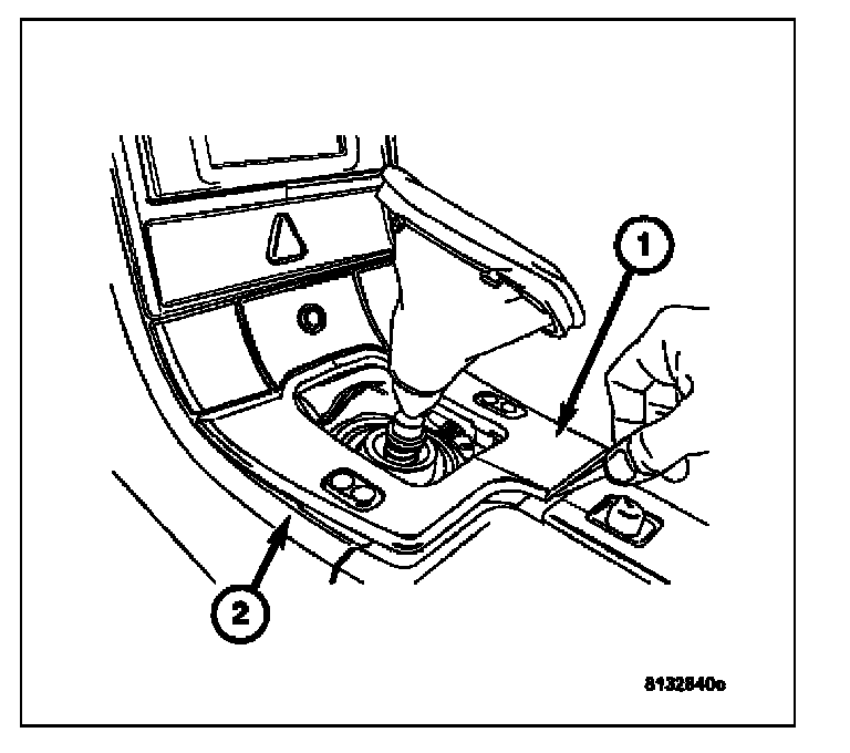 4. Slide the shifter bezel (1) over the leather shifter boot (2) and lay the bezel on the side of the console.