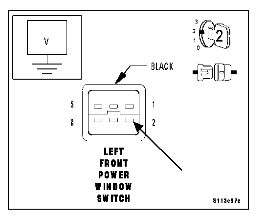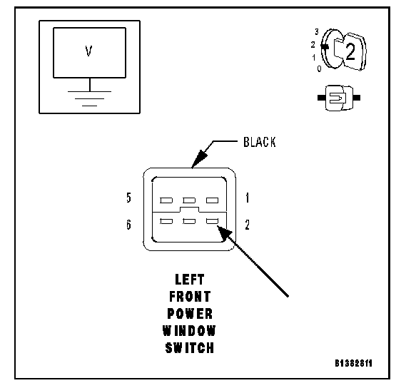 Push and hold the Left Power Window Switch to roll down the window. While holding the Left Front Power Window Switch down and then up, measure the voltage of the Left Power Window Switch Sense circuit by backprobing the Left Front Power Window Switch harness connector.