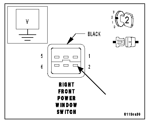 Measure the voltage of the Right Power Window Switch Sense circuit at the Right Front Power Window Switch harness connector.
