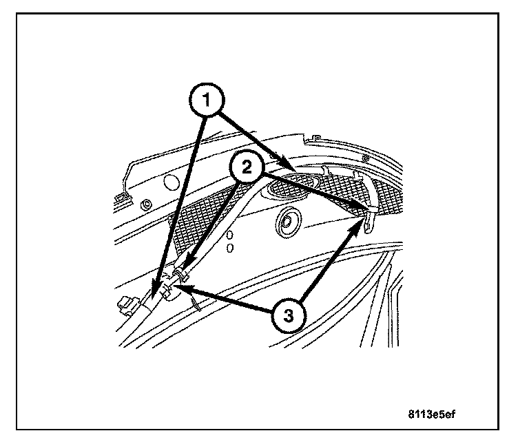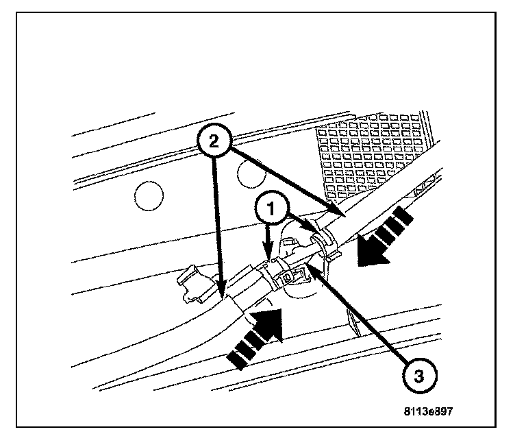3. Install the washer hose(s) (2) to the washer nozzle (3) and secure the washer hose attachment clamp(s) (1) and the two washer hose retaining clips.