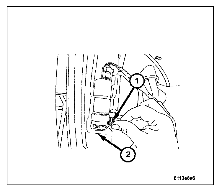 1. Route the washer hose (1) through the cowl opening and attach to the washer pump motor (2). Secure the attachment clamp.