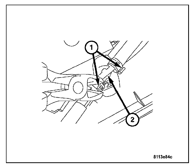 1. Install the washer nozzle (1) into the cowl grille (2). Press downward with a rocking motion until the retaining clip is fully seated.