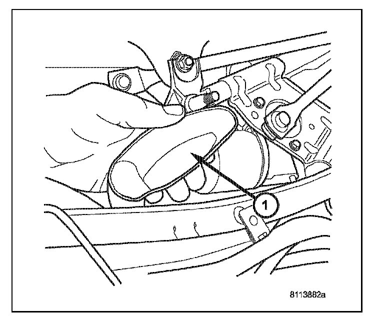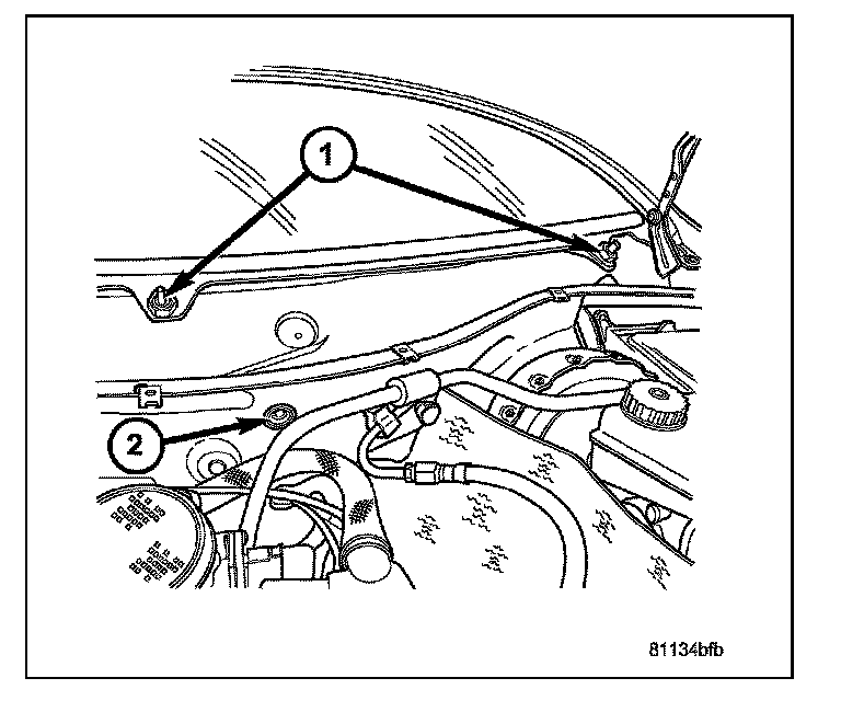 1. Align the wiper module into the cowl over the two upper attachment nut mounting studs (1).