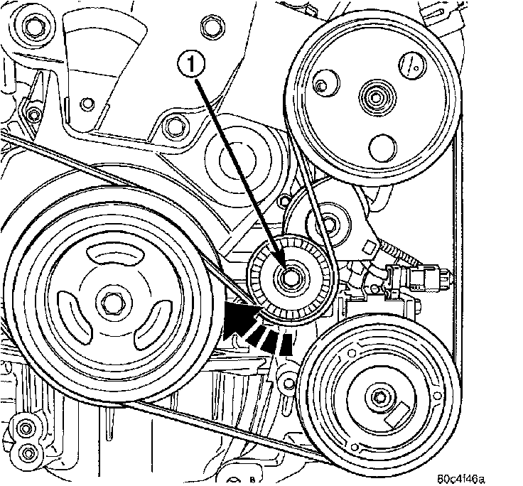 2. Using a wrench, rotate belt tensioner clockwise until belt can be installed onto power steering pump pulley. Release spring tension onto belt.