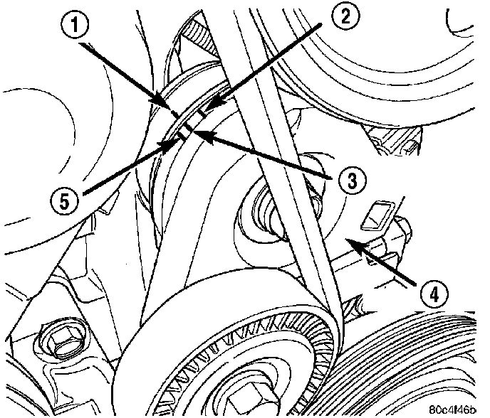 3. After belt is installed, inspect belt length indicator marks (2, 3, and 5). The indicator mark should be within the minimum belt length and maximum belt length marks. On a new belt, the indicator mark should align approximately with the nominal belt length mark.