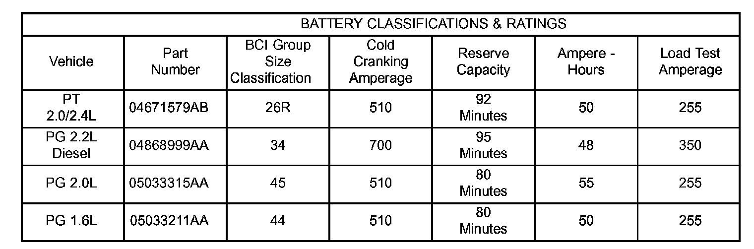 NOTE: Vehicles equipped with a diesel engine utilize a unique battery. The specifications for this battery may differ from the standards shown here. Refer to the battery manufacturer for detailed specifications.