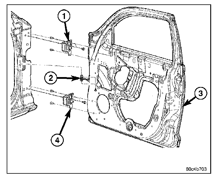 2. Remove bolts attaching door check strap (2) to lower A-pillar for greater access, if necessary.
