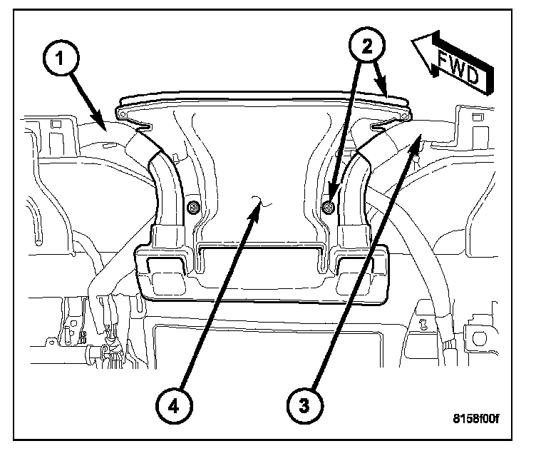13. Install the four screws (2) that secure the defroster duct to the instrument panel. Tighten the screws to 2 N.m (17 in. lbs.).