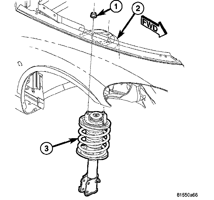 1. Raise the strut assembly (3) into the strut tower (2), aligning the three studs on the strut assembly upper mount with the holes in strut tower. Install the three mounting nuts (1) on the studs. Tighten the three nuts to 26 Nm (19 ft. lbs.).