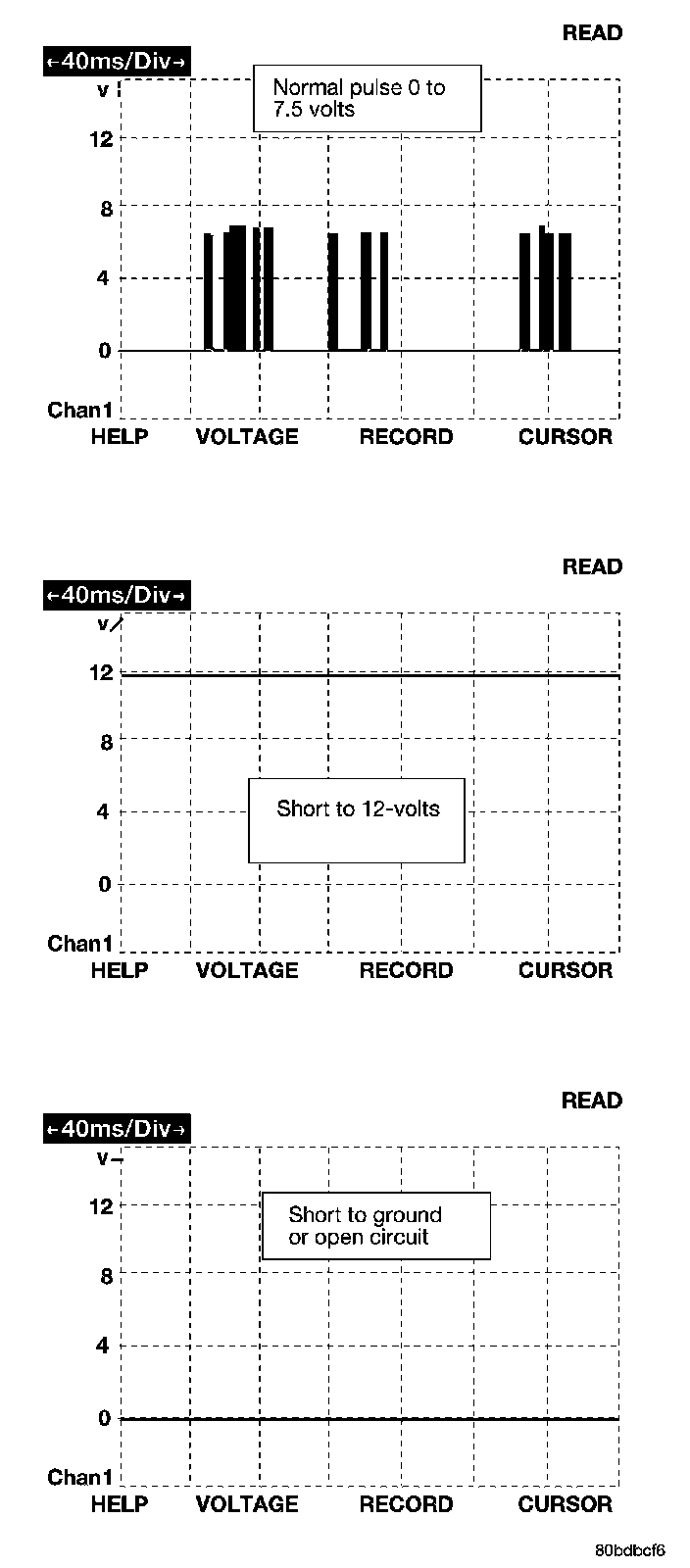 The bus messages are transmitted at a rate averaging 10800 bits per second. Since there is only voltage present when the modules transmit and the message length is only about 500 milliseconds, it is ineffective to try and measure the bus activity with a conventional voltmeter. The preferred method is to use the DRBIII(R) lab scope. The 12 v square wave selection on the 20-volt scale provides a good view of the bus activity. Voltage on the bus should pulse between zero and about seven and a half volts. Refer to the following illustration for some typical displays.