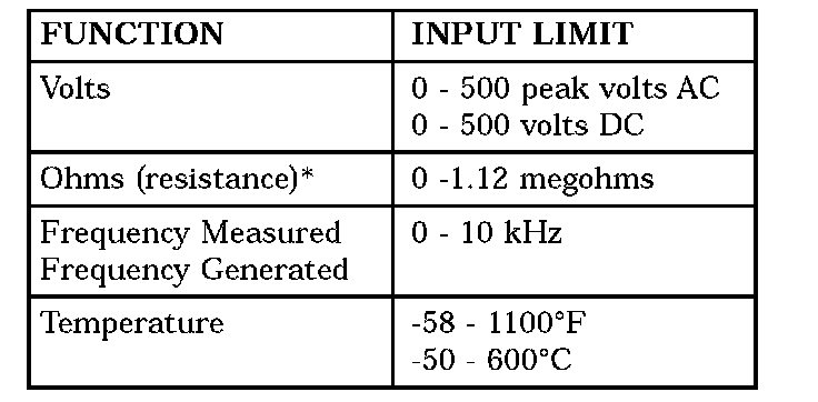 * Ohms cannot be measured if voltage is present. Ohms can be measured only in a non-powered circuit.