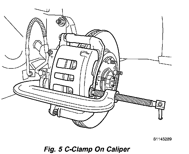4) Place an appropriately sized C-Clamp over brake caliper as shown (Fig. 5), placing screw-drive head against outboard shoe and hook against rear of caliper. Slowly tighten screw-drive retracting caliper pistons into bores and breaking outboard brake shoe free from caliper fingers. Do not overtighten C-Clamp. Remove C-Clamp.