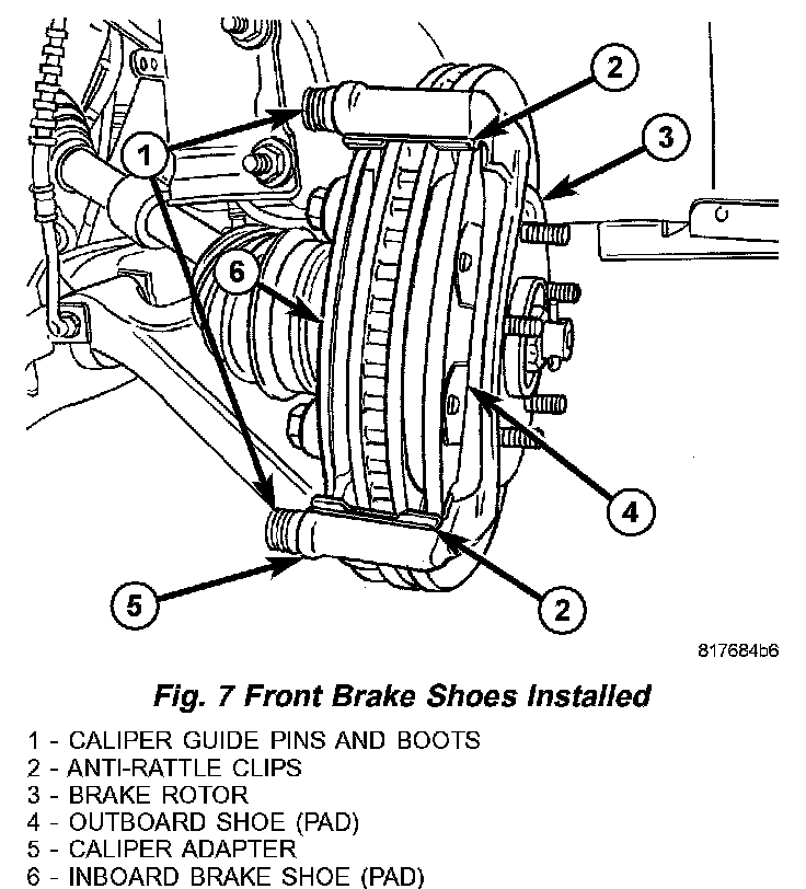 9) Remove brake shoes from disc brake caliper adapter (Fig. 7).