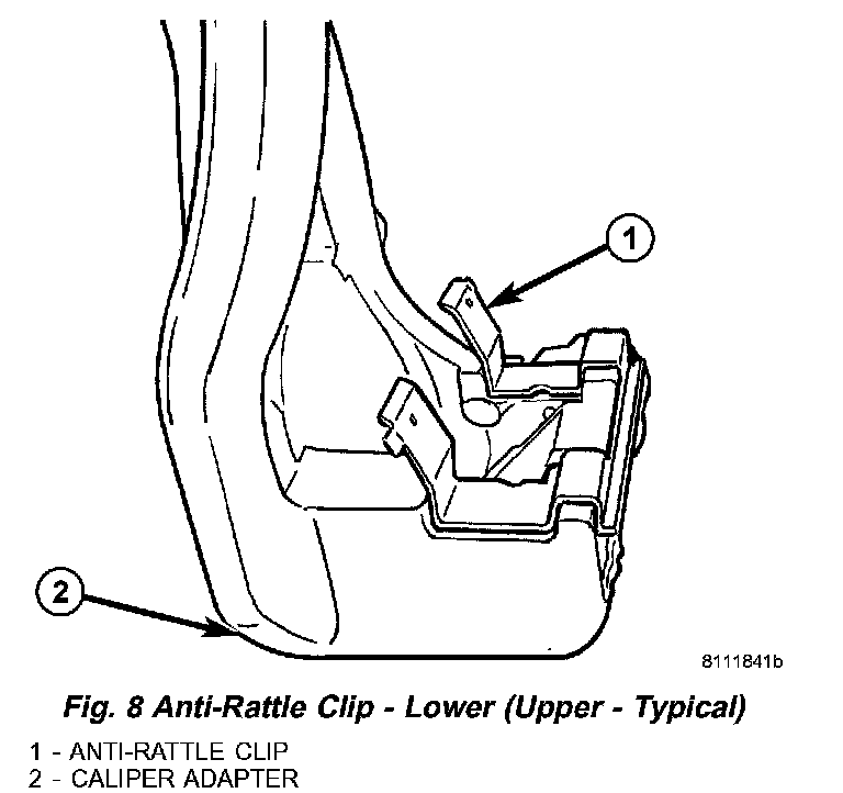 1) Place brake shoes in anti-rattle clips on adapter (Fig. 7). Make sure clips are properly installed (Fig. 8).