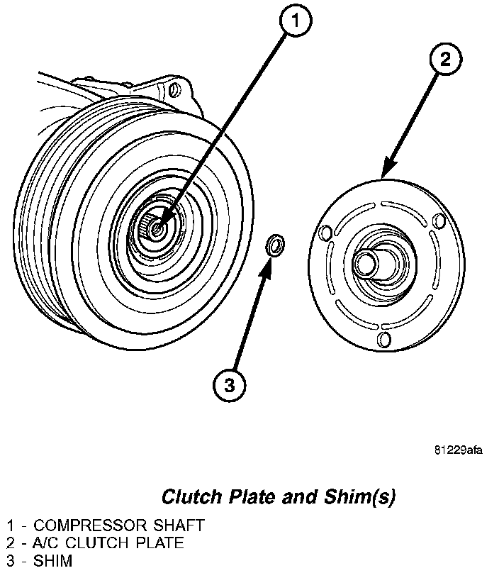 6. If the original clutch plate and clutch pulley are to be reused, reinstall the original shim(s) on the compressor shaft against the shoulder. If a new clutch plate and/or clutch pulley are being used, install a trial stack of shims 2.54 mm (0.010 in.) thick on the compressor shaft against the shoulder.