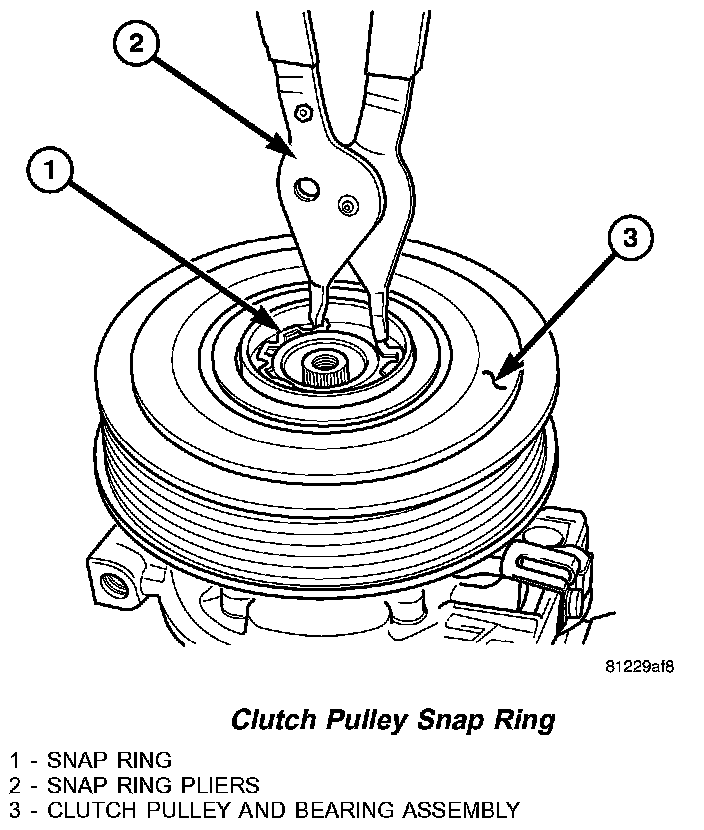 NOTE: A new snap ring must be used to secure the clutch pulley to the A/C compressor. The bevel side of the snap ring must face outward.