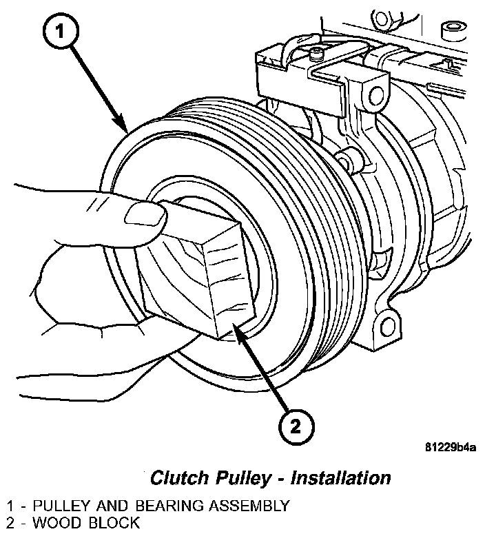 4. Install the pulley and bearing assembly onto the front of the A/C compressor. If necessary, tap the pulley gently with a block of wood placed on the pulley friction surface.