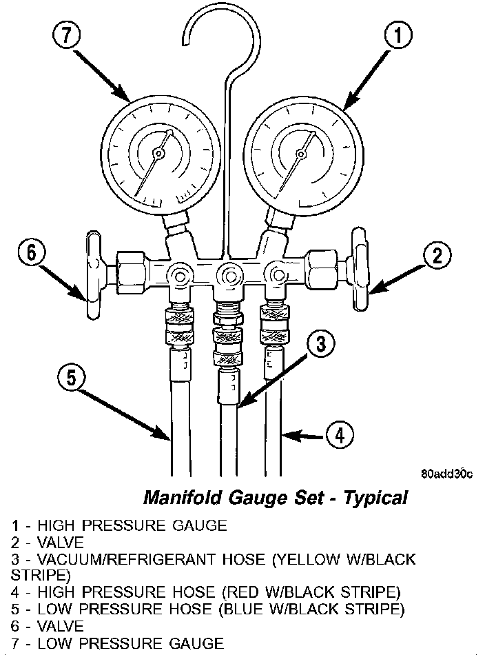 A manifold gauge set may be needed with some recovery/recycling/charging equipment. The manifold gauge set should have manual shut-off valves, or automatic back-flow valves located at the service port connector end of the manifold gauge set hoses. This will prevent refrigerant from being released into the atmosphere.