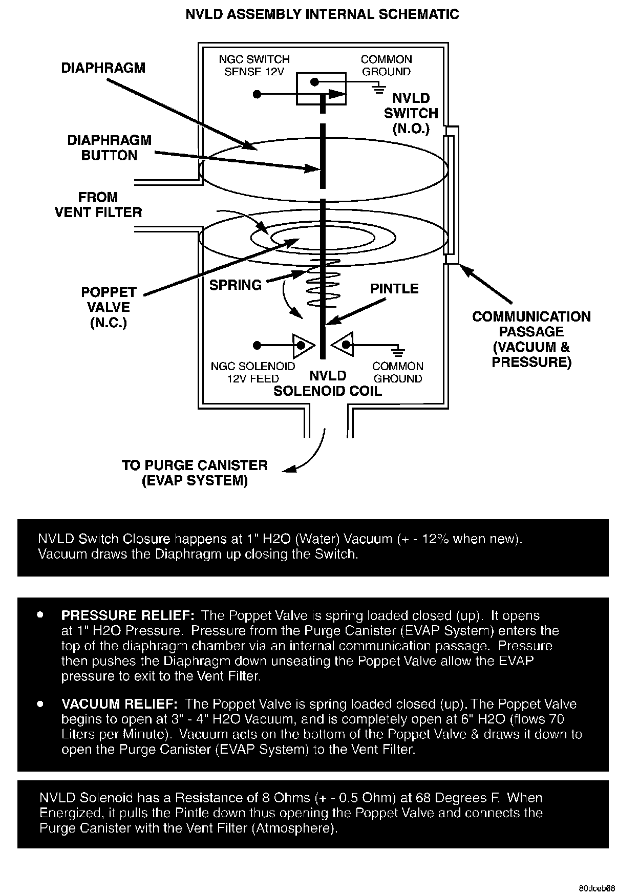 The normally closed valve in the NVLD is intended to maintain the seal on the evaporative system during the engine off condition. If vacuum in the evaporative system exceeds 3 inches to 6 inches H2O (0.75 to 1.5 KPA), the valve will be pulled off the seat, opening the seal. This will protect the system from excessive vacuum as well as allowing sufficient purge flow in the event that the solenoid was to become inoperative. The solenoid actuates the valve to unseal the canister vent while the engine is running. It also will be used to close the vent during the medium and large leak tests and during the purge flow check. This solenoid requires initial 1.5 amps of current to pull the valve open but after 100 ms. will be duty cycled down to an average of about 150 mA for the remainder of the drive cycle.