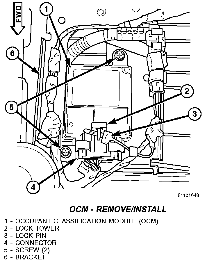 WARNING: TO AVOID PERSONAL INJURY OR DEATH, ON VEHICLES EQUIPPED WITH THE OCCUPANT CLASSIFICATION SYSTEM (OCS), ONLY THE OCCUPANT CLASSIFICATION MODULE (OCM) MAY BE SERVICED SEPARATELY. ALL OTHER COMPONENTS OF THE PASSENGER FRONT SEAT CUSHION MUST BE SERVICED ONLY AS A COMPLETE FACTORY-CALIBRATED, ASSEMBLED AND TAMPER-EVIDENT SERVICE REPLACEMENT PACKAGE.